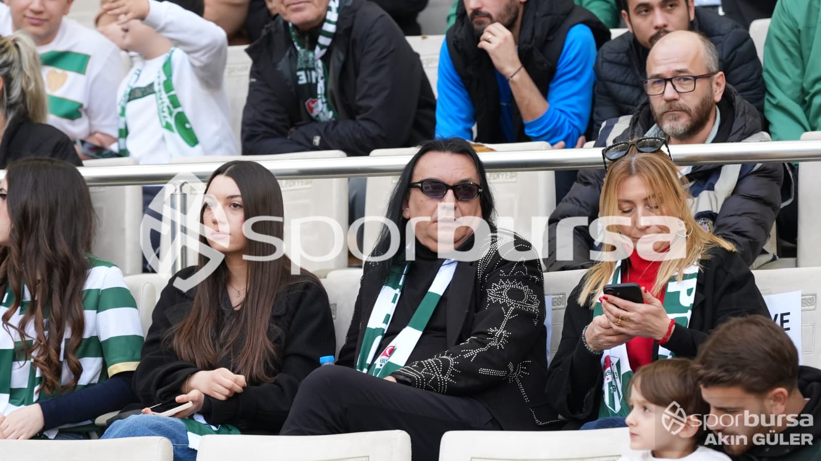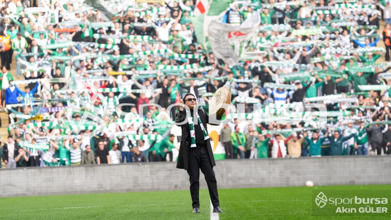 Ünlü sanatçı, daha sonra Bursaspor kulübesinin arkasına oturdu ve bol bol tribünleri çekti, maçı izledi.