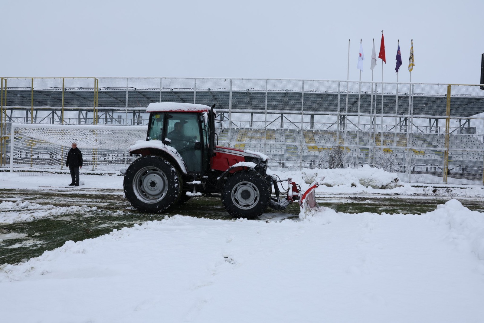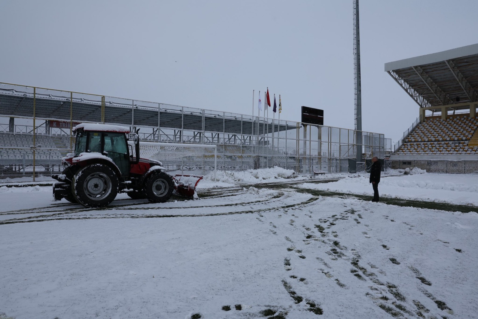 Ekipler kar yağışı nedeniyle karla kaplanan stadyumda yürütülen kar temizleme çalışmalarını sabahın erken saatlerinden itibaren yeniden başlattılar.