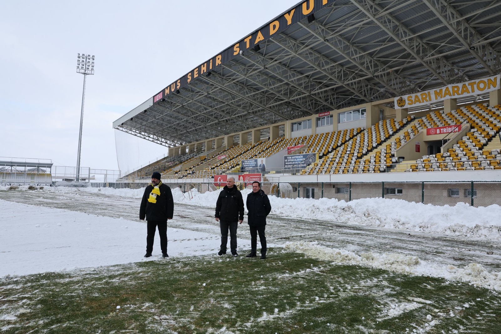 Muş Gençlik Spor İl Müdürü Yusuf Kılıç, da Muş Şehir Stadyumu’nda oynanacak Muşspor–Bursaspor maçı öncesi yoğun kar yağışı nedeniyle stadyumda yürütülen kar küreme çalışmalarını gece saatlerinde yerinde takip etti.
