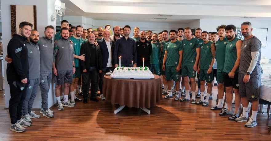 Bursasporlu yönetim kurulu üyeleri, teknik heyet ve futbolcular, 39 yaşına basan Başkan Enes Çelik'in doğum gününü tesislerde kutladı.