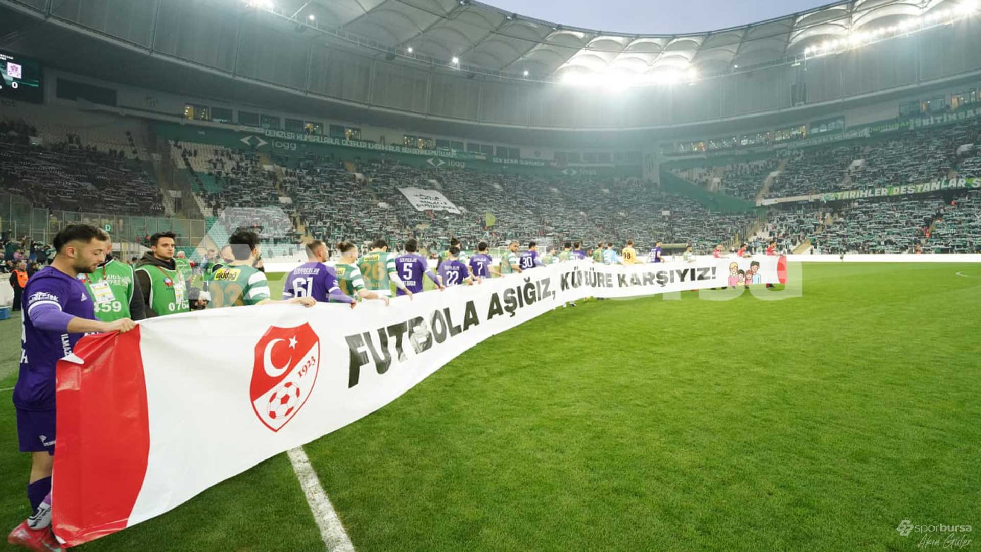 Bursasporlu oyuncular sahaya ısınma için çıkarken, ellerinde 'Depreme karşı bilinçli toplum, dirençli Bursa' pankartıyla çıktı.