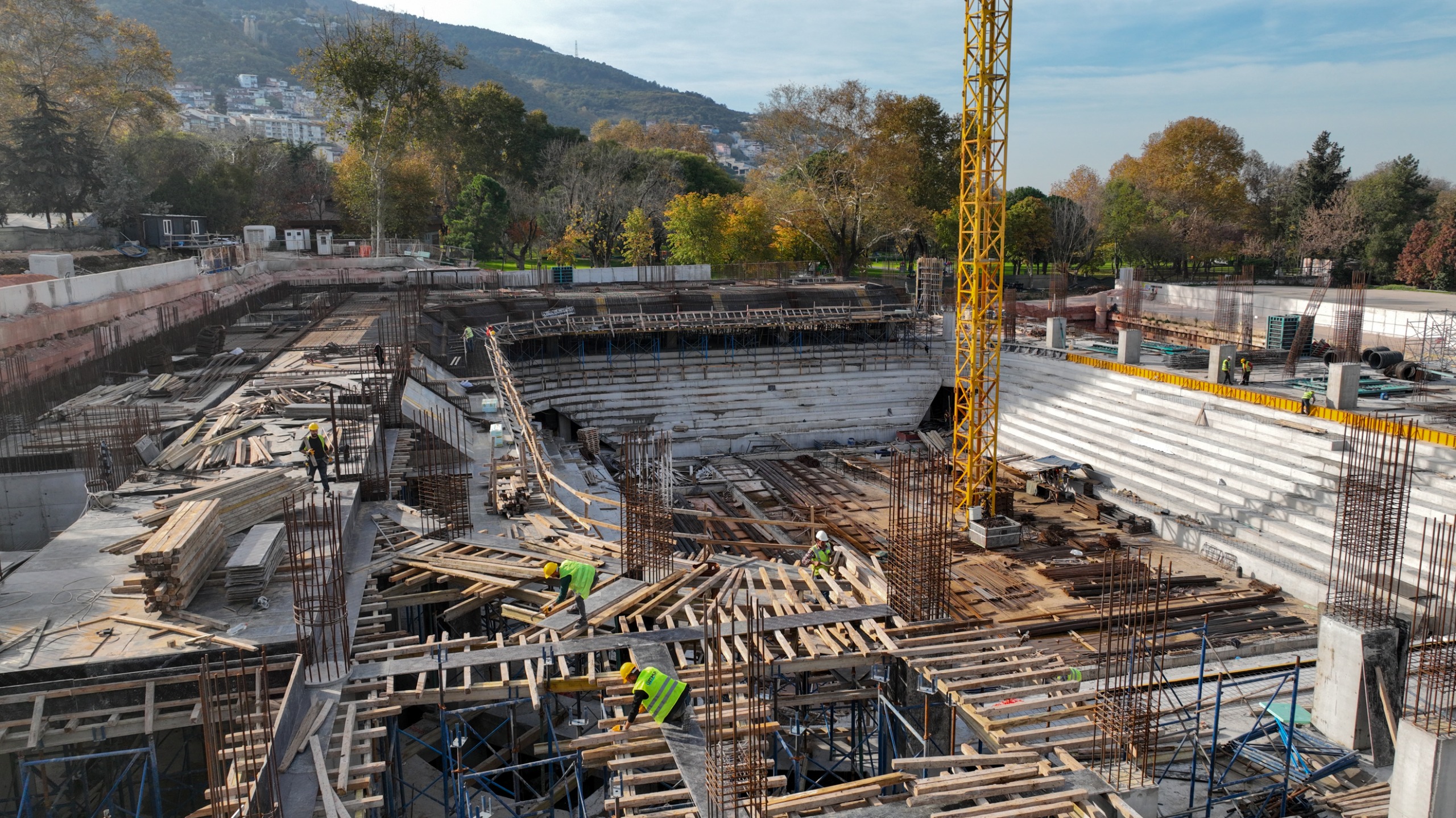 Bursa Büyükşehir Belediyesi tarafından tekrar ayağa kaldırılacak kentin simge yapılarından Atatürk Spor Salonu’nda inşaat tüm hızıyla devam ediyor.
