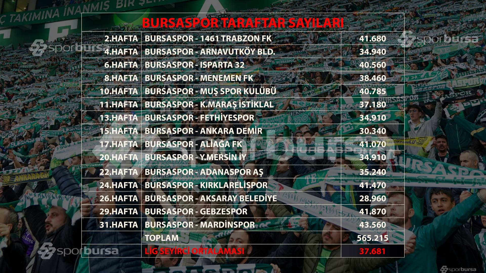 Bursaspor'un bu sezon iç sahada oynadığı 15 maçı, Atatürk Spor Kompleksi Matlı Stadyumu'nda toplam 565 bin 215 kişi izledi. Bu rakam, şu ana kadar Galatasaray için 416 bin, Fenerbahçe için ise 361 kişi düzeyinde...