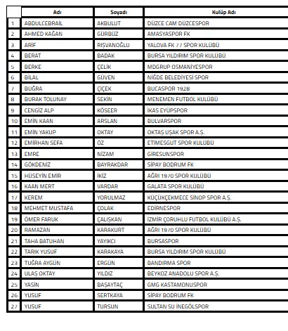 “Türkiye Futbol Federasyonu’nca profesyonel liglere yönelik olarak yürütülen bahis soruşturması kapsamında 10.11.2025 tarihinde PFDK’ya sevk edilen 1024 futbolcunun haricinde sadece tek bir kere bahis hareketi olduğu görülen ve incelemesi devam eden 47 futbolcudan soruşturması tamamlanan aşağıdaki 27 futbolcunun Futbol Disiplin Talimatı’nın 57. maddesi uyarınca 09.12.2025 tarihinden itibaren tedbirli olarak PFDK'ya sevk edilmesine karar verilmiştir.
