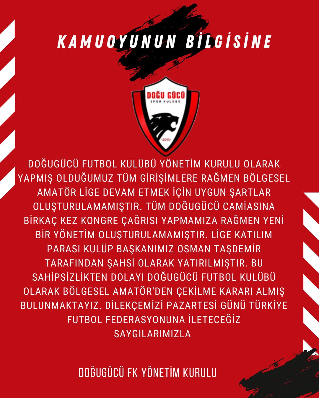 Doğugücüspor yönetimi, yaptığı açıklamada Bölgesel Amatör Lig'e katılım bedelini yatırmış olmalarına rağmen lige katılmama kararı aldıklarını spor kamuoyuna duyurdu.