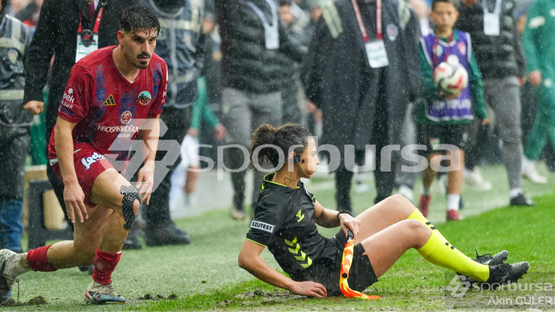 Bursaspor-Mardinspor maçında 1.Yardımcı Hakem olan Esra Arıkboğa, maçın sonlarına doğru iki futbolcunun kıran kırana mücadelesinin tam ortasında kaldı ve kendini bir anda yerde buldu.