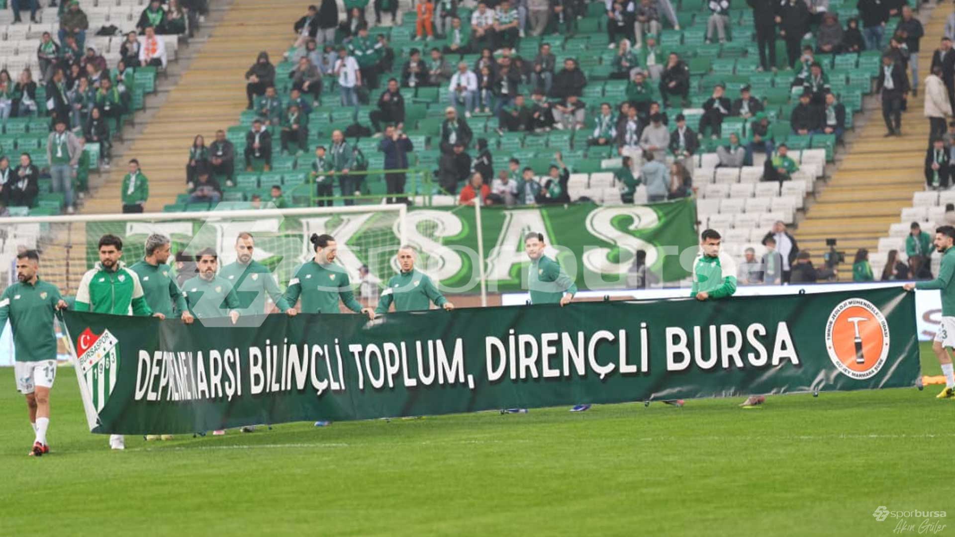 Bursasporlu oyuncular sahaya ısınma için çıkarken, ellerinde 'Depreme karşı bilinçli toplum, dirençli Bursa' pankartıyla çıktı.