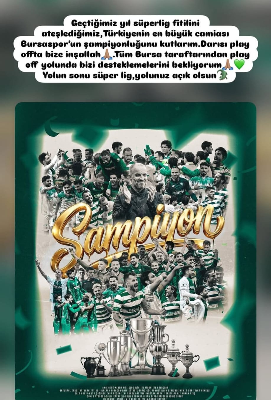 “Geçtiğimiz yıl Süper Lig fitilini ateşlediğimiz, Türkiye’nin en büyük camiası Bursaspor’un şampiyonluğunu kutlarım. Darısı play-off’ta bize inşallah. Tüm Bursaspor taraftarından play-off yolunda bizi desteklemelerini bekliyorum. Yolun sonu Süper Lig; yolunuz açık olsun!”