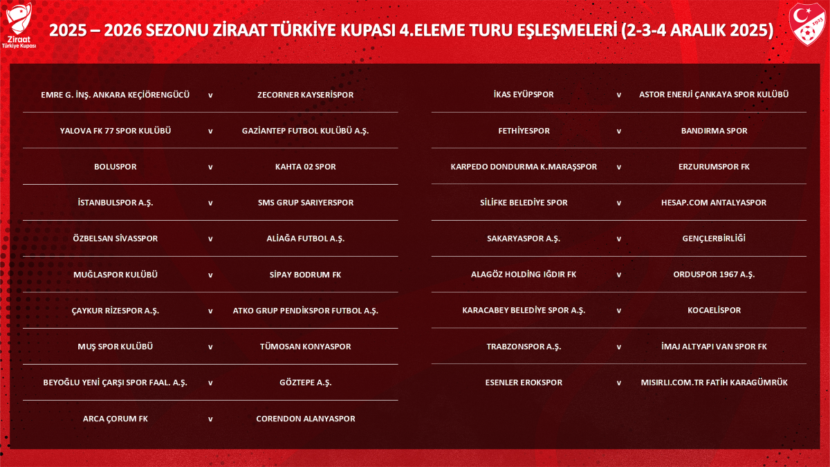 Ziraat Türkiye Kupası 4. Eleme Turu müsabakaları tek maç eleme usulüne göre 2, 3 ve 4 Aralık'ta oynanacak.