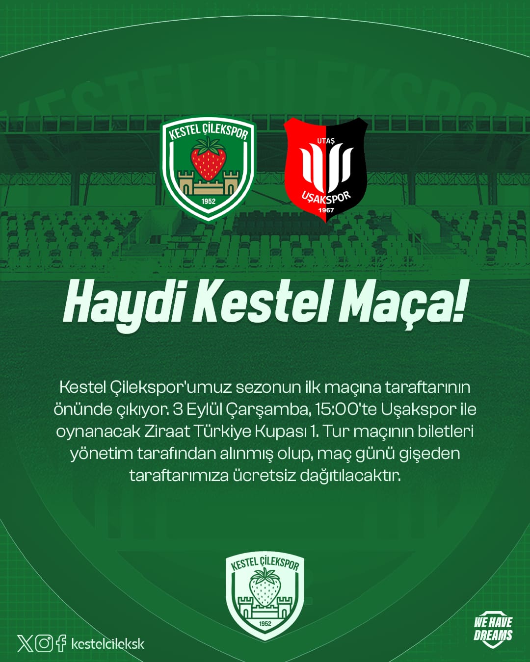 Nesine 3.Lig 1. Grup’ta mücadele edecek olan Kestel Çilekspor, yeni sezonun ilk resmi karşılaşmasını 3 Eylül Çarşamba günü saat 15.00’de Uşakspor ile yapacak. Minareli Çavuş Stadı’nda oynanacak mücadelenin biletleri yönetim kurulu tarafından satın alındı.