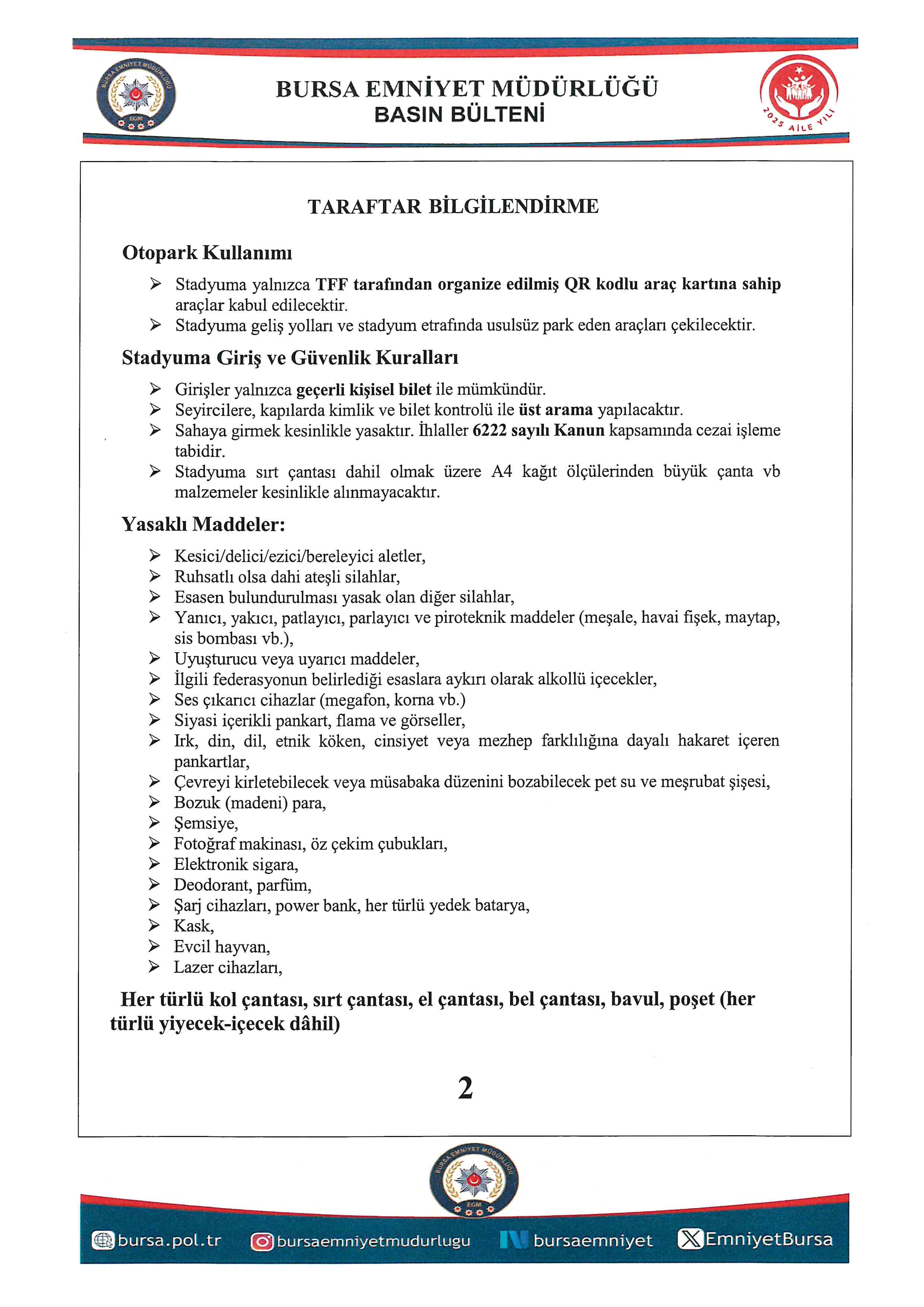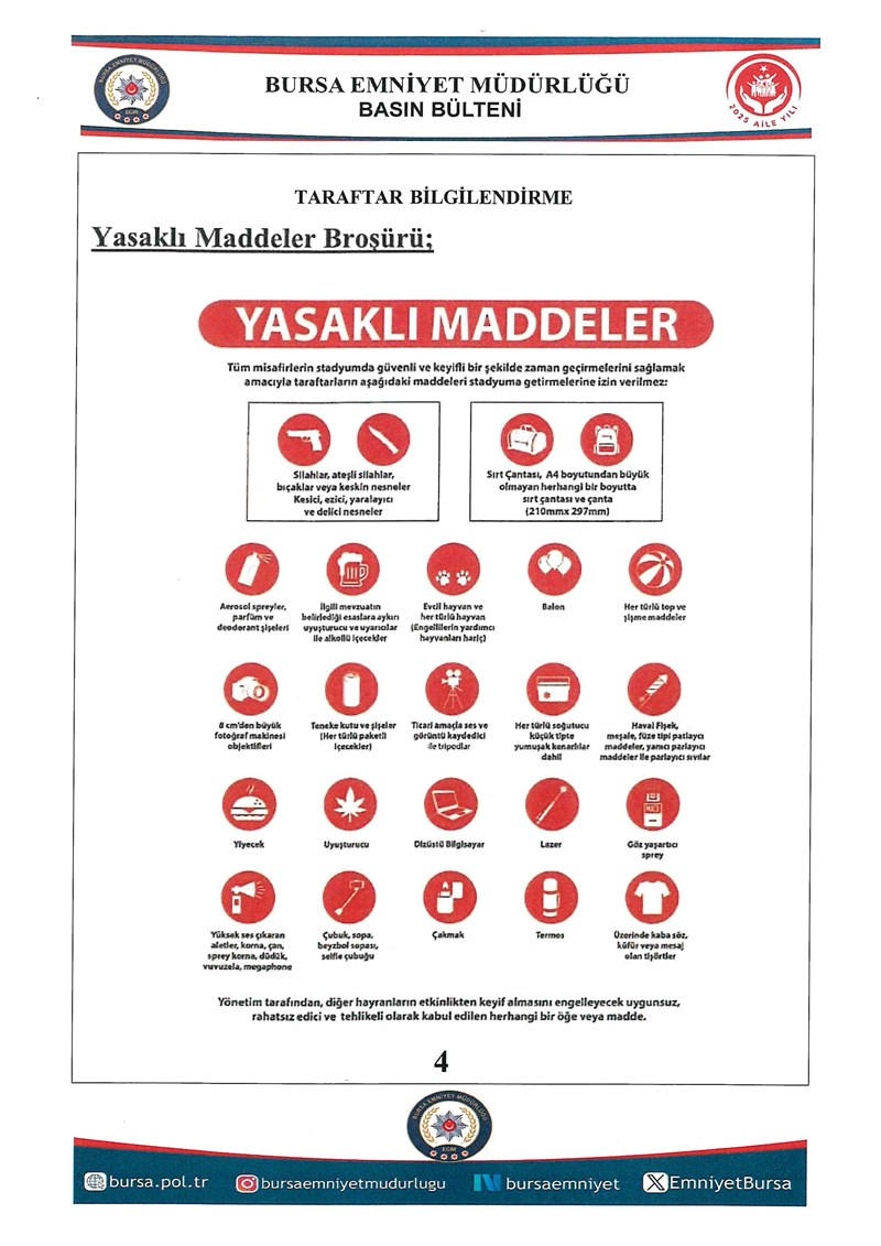 olduğundan, müsabakadan 4 gün öncesine kadar Bursa İl Emniyet Müdürlüğü Spor