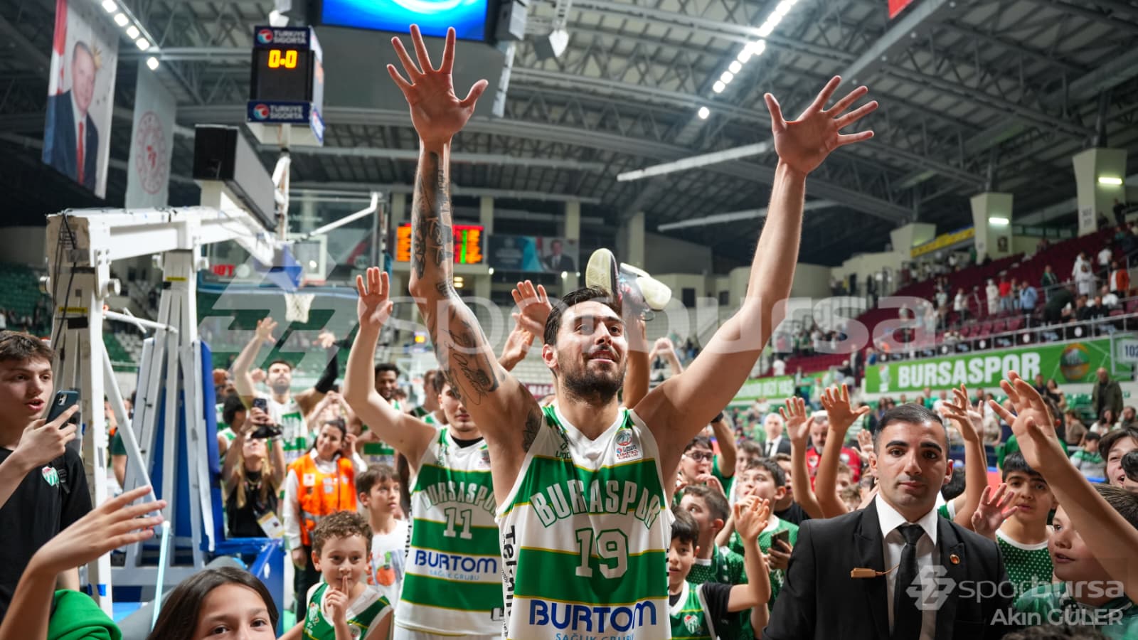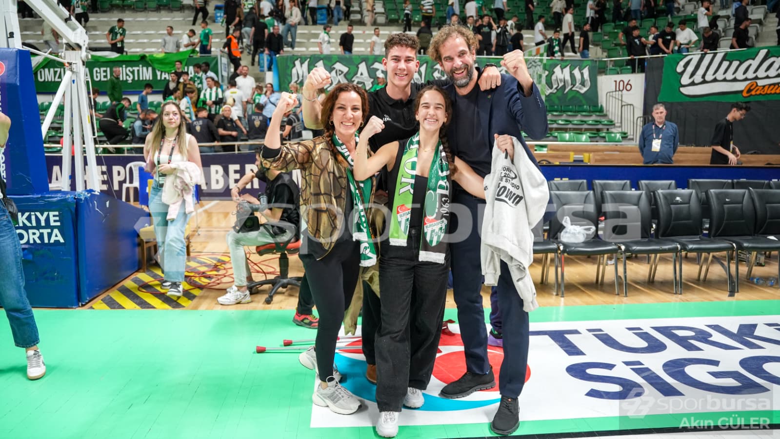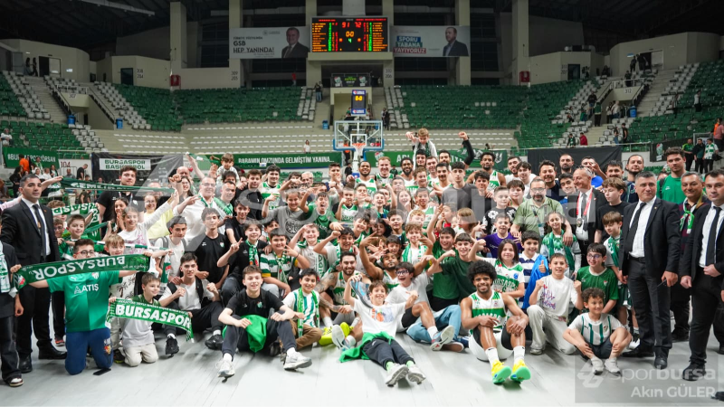 Maçtan sonra Teksas'ın önüne giden Yavuz Gültekin ve Bursasporlu basketbolcular, taraftara üçlü çektirdi.