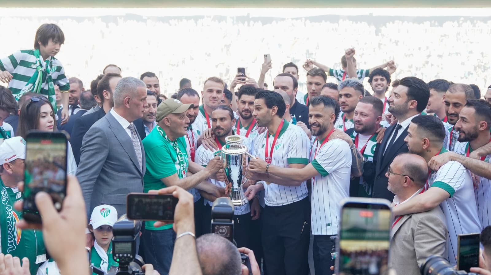 Zemine kurulan dev platforma “Şampiyon Bursaspor” zafer takından geçen futbolcular, kendi seçtikleri şarkılar eşliğinde şampiyonluk yolundan geçti.