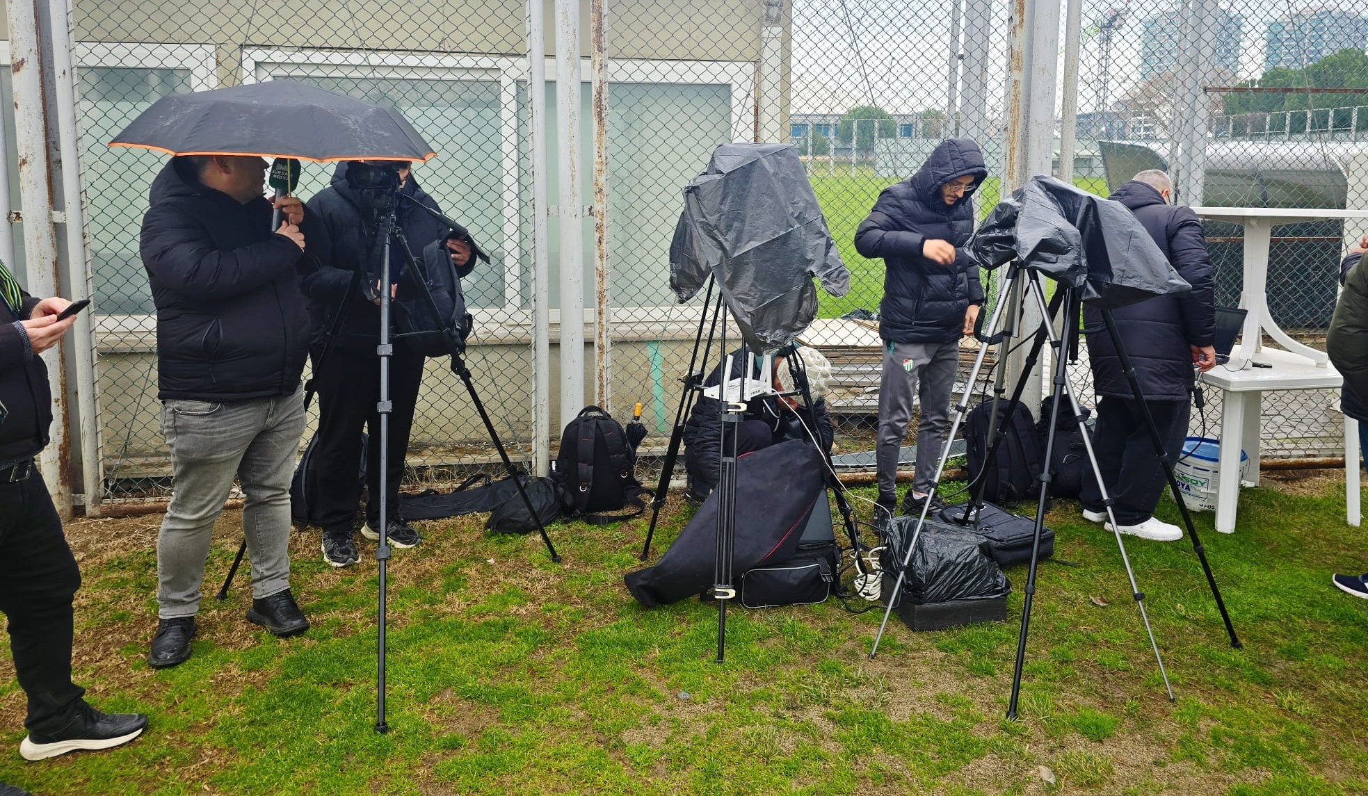 Basın mensupları, yağmur altında Özlüce'de yapılan basın toplantısında kameralar ve teknik malzemeler ıslanmasın diye böyle önlem almaya çalıştı.