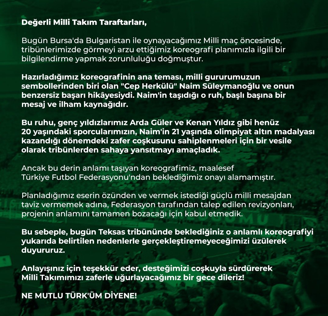 Bursaspor’un sembol taraftar grubu Teksas, Bulgaristan milli maçı için hazırladıkları koreografiye Futbol Federasyonu’nun onay vermediğini açıkladı.