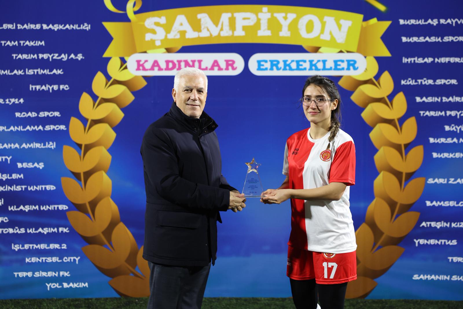 Bursa Büyükşehir Belediyesi ve tüm iştiraklerin katılımıyla Merinos Stadyumu’nda yapılan turnuvada, 49 erkek ve 3 kadın takımı olmak üzere toplam 52 takım kıyasıya mücadele etti. Turnuvaya yaklaşık 800 personel katılırken, turnuvanın kadınlar finalinde ‘Ateşin Kızları’ (İtfaiye Dairesi Başkanlığı) kupanın sahibi oldu. Turnuvada ikinciliği ‘Sahanın Sultanları’ (Zabıta Dairesi Başkanlığı), üçüncülüğü ‘Su Perileri’ (BUSKİ) elde etti.