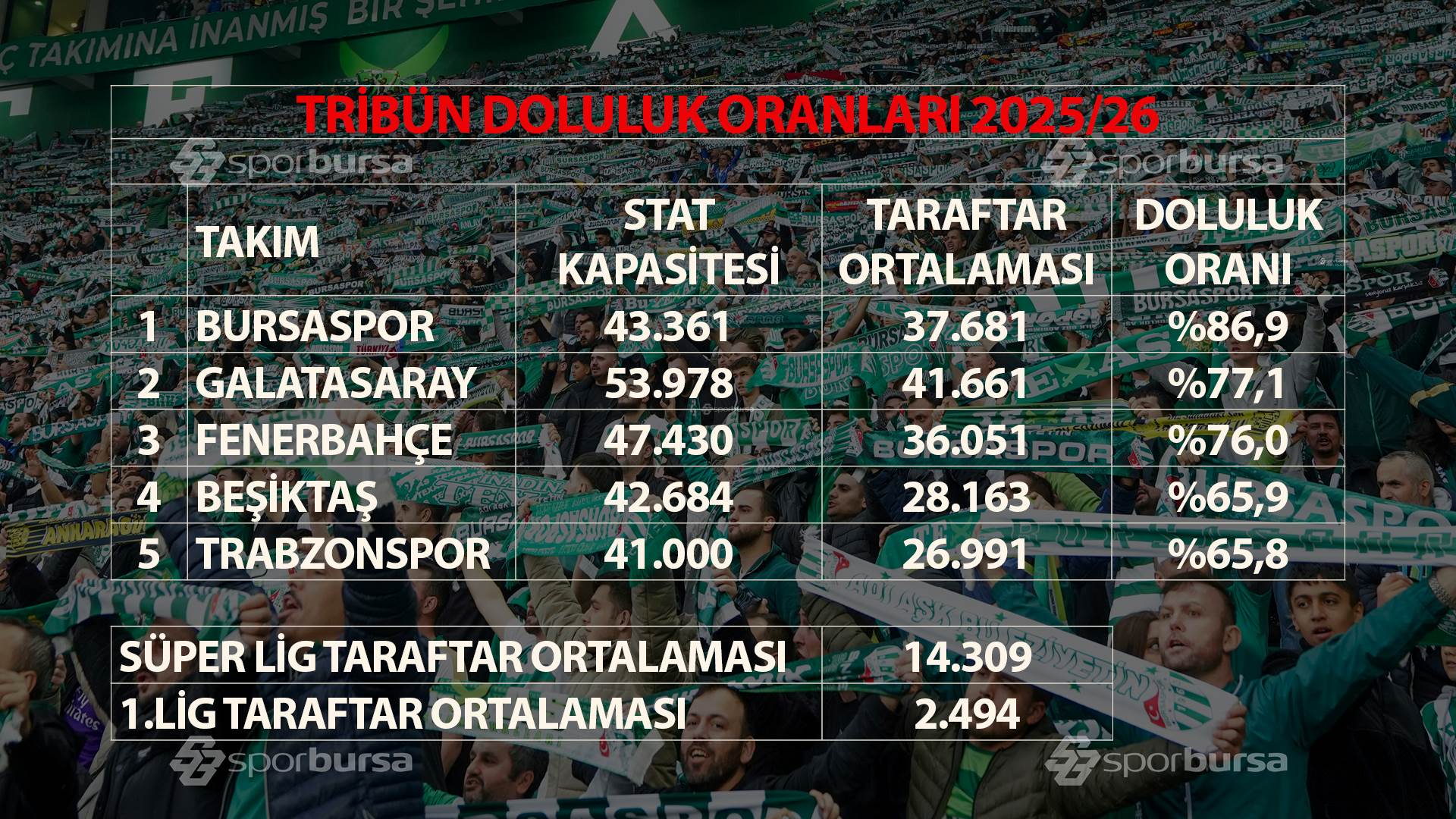Bursaspor'u yüzde 77.1 doluluk oranıyla Galatarasay, yüzde 76 doluluk oranıyla Fenerbahçe, yüzde 65.9 doluluk oranıyla Beşiktaş ve yüzde 65.8 doluluk oranıyla Trabzonspor takip ediyor.