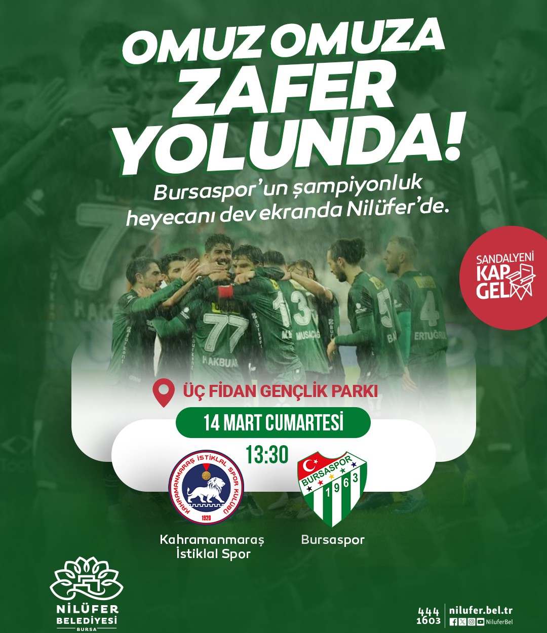 Bu heyecana taraftarları davet eden Nilüfer Belediye Başkanı Şadi Özdemir, “Gelin, takımımızın deplasmanda vereceği bu önemli mücadeleyi Üç Fidan Gençlik Parkı’nda omuz omuza birlikte izleyelim. Şampiyonluk mücadelesinin heyecanını hep beraber yaşayalım” dedi.