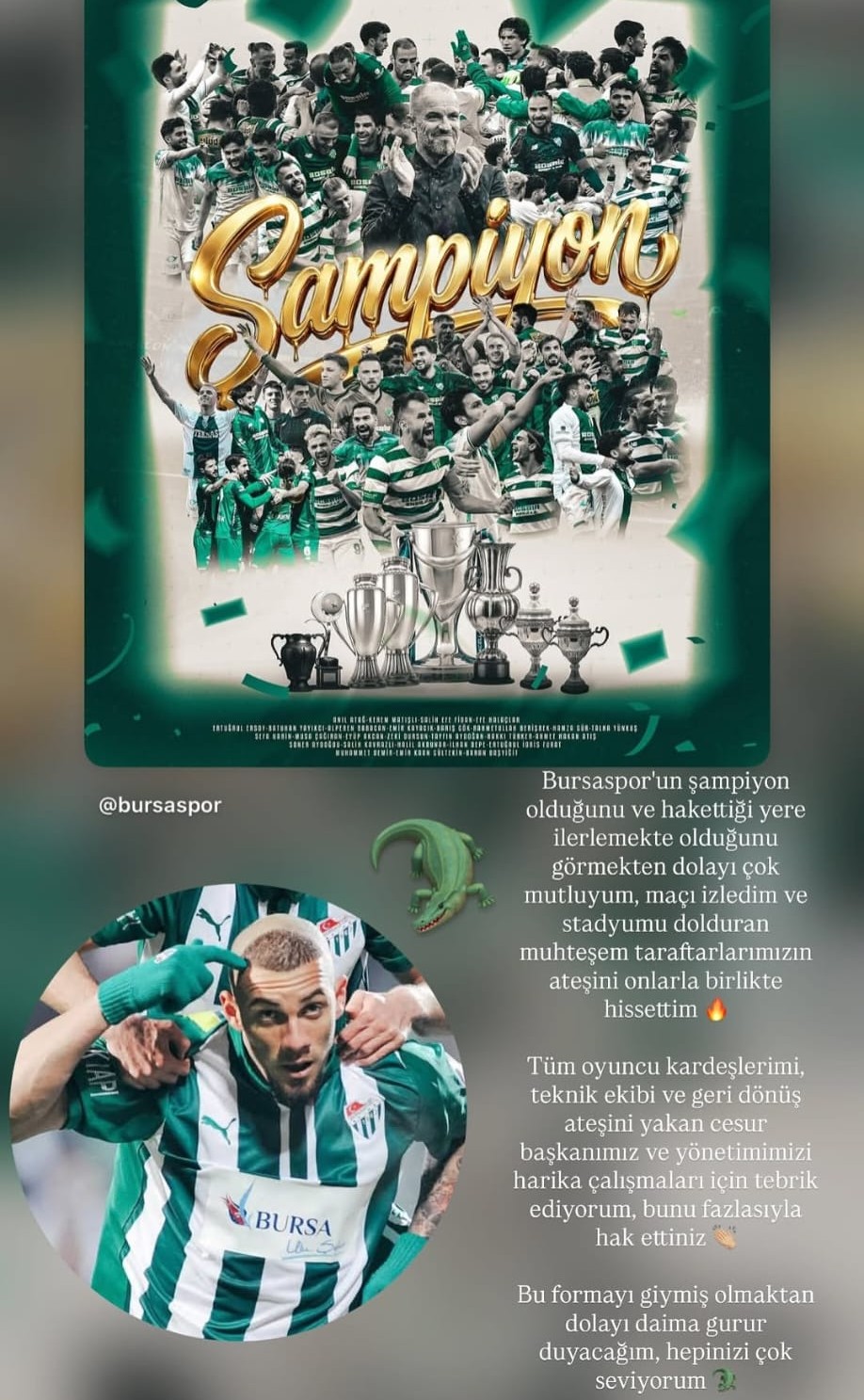 "Bursaspor'un şampiyon olduğunu ve hak ettiği yere ilerlemekte olduğunu görmekten dolayı çok mutluyum. Maçı izledim ve stadyumu dolduran muhteşem taraftarımızın ateşini onlarla birlikte hissettim. Tüm oyuncu kardeşlerimi, teknik ekibi ve geri dönüş ateşini yakan cesur başkanımız ve yönetimimizi harika çalışmaları için tebrik ediyorum. Bunu fazlasıyla hak ettiniz. Bu formayı giymiş olmaktan dolayı daima gurur duyacağım. Hepinizi çok seviyorum.”