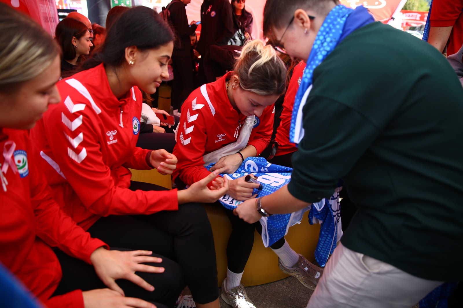 sporculardan bol bol imza alırken, forma ve atkı alarak onları voleybolculara